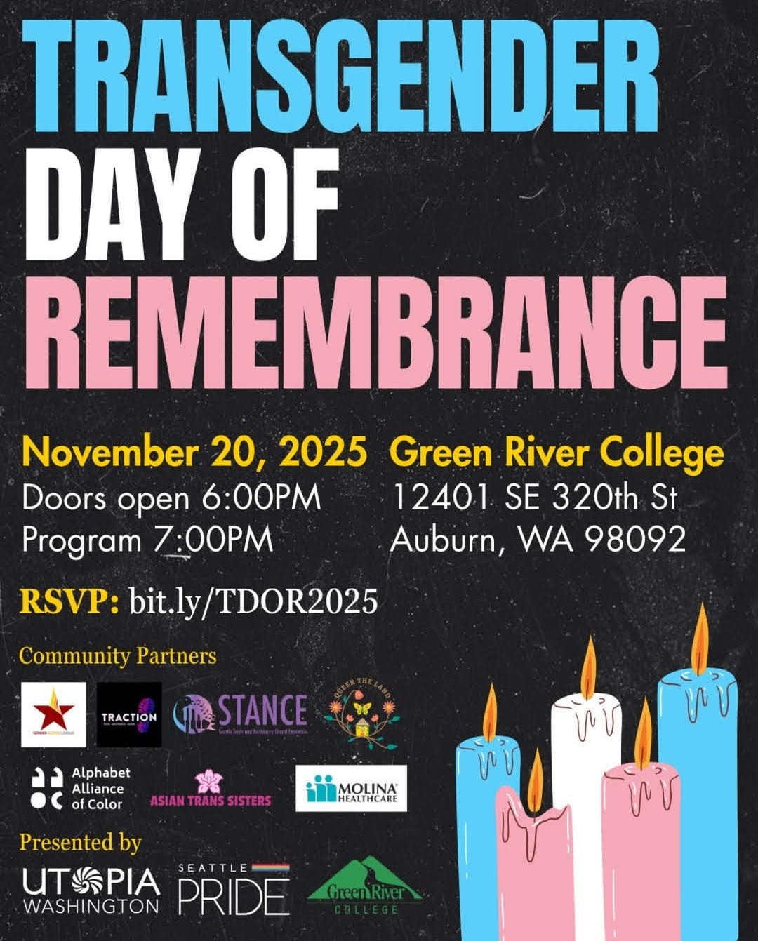 We hope you’ll join us tomorrow night alongside hosts UTOPIA Washington, Seattle Pride, and Seattle’s LGBTQ+ Center for an evening of Trans excellence, remembrance, and community care, as we gather to honor our Trans and gender diverse siblings whose lives were taken too soon by anti-Trans violence and systemic harm.